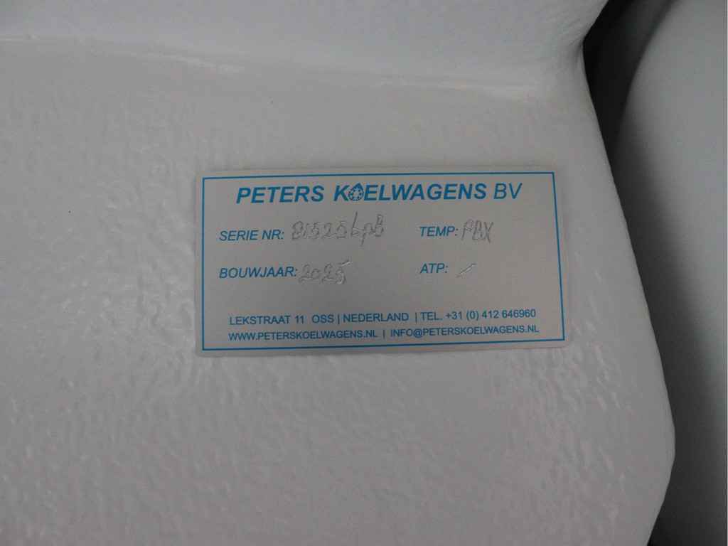 Afmeting laadruimte ongeïsoleerd:,327 x 178 x 194 cm. Laadruimte temp.:0°C bij temp. tot 30°C omgevingstemp. Certificering: conform HACCP, certificaat meegeleverd Specificaties koelmachine Merk : PBX Type : Ecos M24 Heetgasverwarming : ja Bediening : via een app, tablet meegeleverd Koudemiddel : natuurlijk R290 en Glycol Capaciteit motoraandr. : meting volgens A.T.P. norm bij 30°C omgevingstemperatuur 1.460 Watt bij 0 °C laadruimte temperatuur Verwarmingscapaciteit : meting volgens A.T.P. norm -18°C omgevingstemperatuur 900 Watt bij +18°C laadruimte temperatuur Luchthoeveelheid : 1.500 m³/uur Verdamper type : compacte plafondverdamper Afmetingen condensor : 864 x 480 x 233 (lxdxh in mm)
